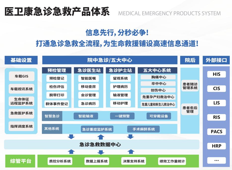医卫康急诊临床信息系统针对急诊科发展趋势,根据卫生部的急诊分诊标准(《急诊病人病情分级试点指导原则》),设计 开发专业智能的急诊分诊系统;根据卫生部的急诊质控要求,详细记录病人在每个救治环节所经历的时间,实现患者、医务 人员、设备精细化管理。通过对急诊科流程改造和智能化设计和实现,有效提升急诊科临床工作效率,促进急诊科室管理精 细化。基于胸痛中心、卒中中心、创伤中心、中毒救治中心、高危孕产妇救治中心、新生儿救治中心建设的大急救与区域协同救治 理念⸺实现以患者为中心、救治时序为主线,急救医疗数据自动采集、院前与院内急救无缝衔接、移动会诊、双向转诊、 多方协同工作、院内手术全程跟踪,直至患者随访康复的医疗全过程纵向管理,结合急诊临床信息的横向管理,形成大急救 二维管理模式。致力于以此系统性解决中国的急症救治问题,降低发病率、致残率和死亡率,助力完善中国现代化急救保障 体系。