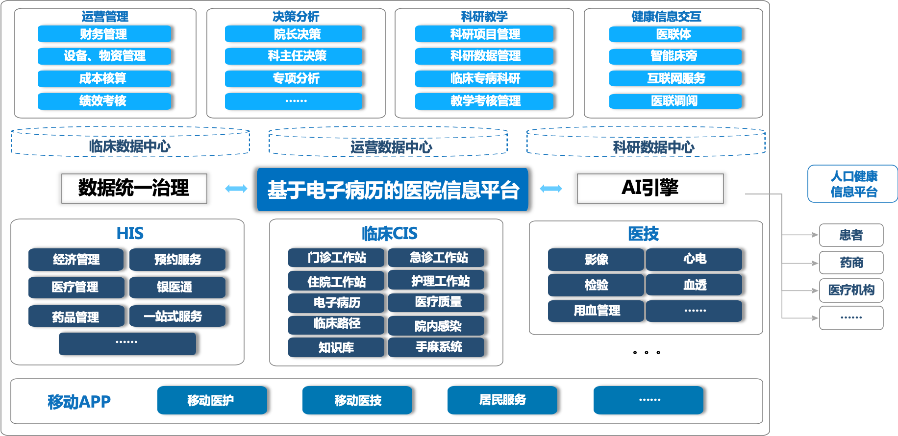 智慧医院以患者为中心,以电子病历为核心,以“提高患者安全、医疗服务质量、运营效益和科研创新”为目标。基于面向服务的架构SOA与业务操作数据库ODS来进行设计,对全院的信息资源(人、财、物、医疗信息)有机整合,打通各个业务系统的信息壁垒,实现全院级别的“互联互通、信息共享、业务协同、智能决策”。为医护人员提供有效的临床诊疗活动的操作平台,推动医院医疗服务业务的持续性发展与创新。